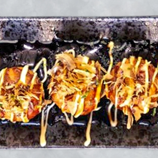 Octopus dumplings deep fried then topped with eel sauce, kewpie mayo, shredded seaweed, & bonito flakes