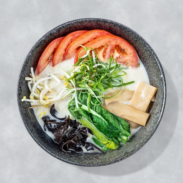 Our vegetable ramen option is a soy bean broth with a light garlic & onion base.Toppings: Tomatoes, wood ear mushrooms, bamboo shoots, bean sprouts, yu choy, & julienned green onions