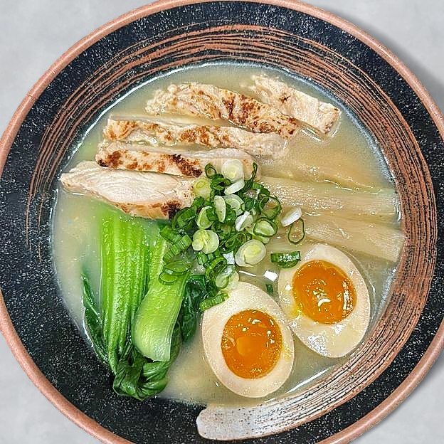 A hearty rich chicken broth with a light ginger & light garlic base.Toppings: A portion of chicken breast, a marinated egg, bamboo shoots, yu choy & julienned green onions