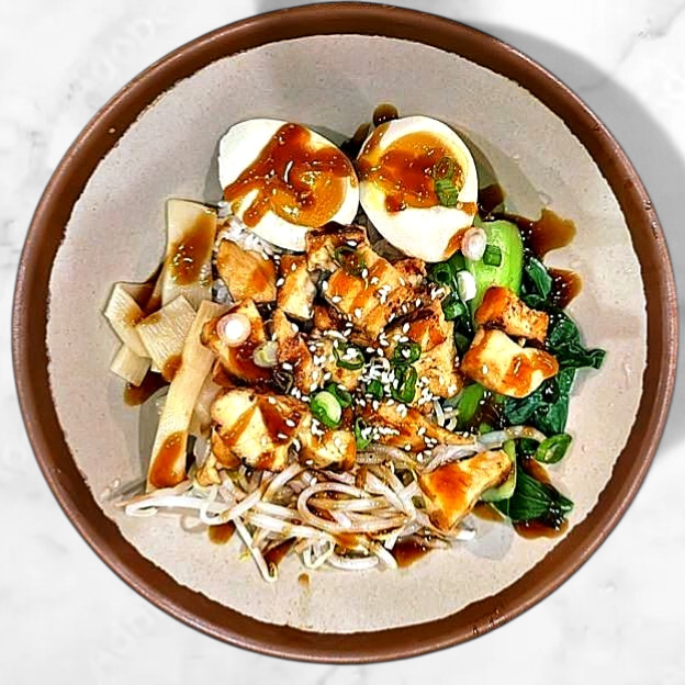 A house favorite rich chicken broth with a sesame & ginger base. Toppings: chopped pork, marinated egg, bok choy, scallions, chili oil, a smear of spcy chili paste & sesame seeds