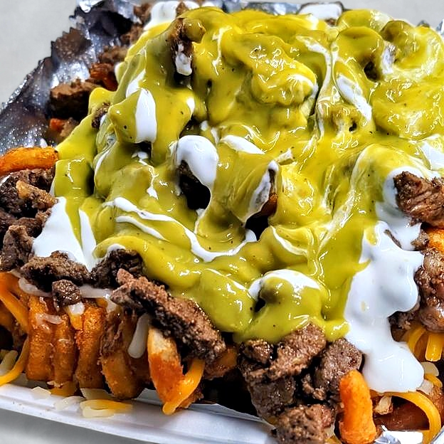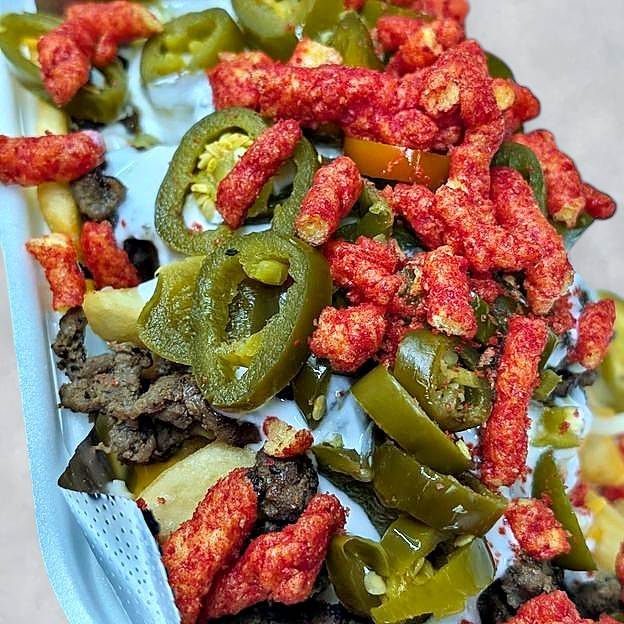 Choose between Curly Fries, Nachos, or Regular Fries. Topped with Nacho. Cheese, Shredded blend cheese, creamy Sour Cream, Flamin Hot Mix, and Jalapeños. Choose between Asada, Alpastor, Chorizo, or get all 3 for no additional cost.