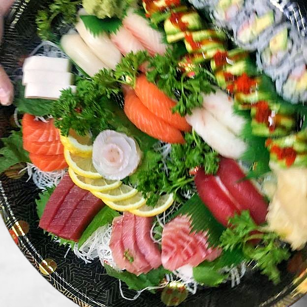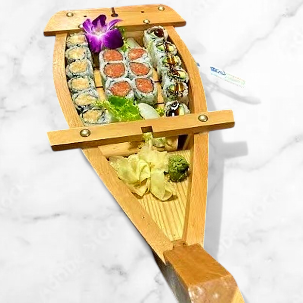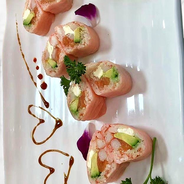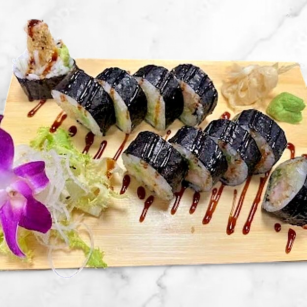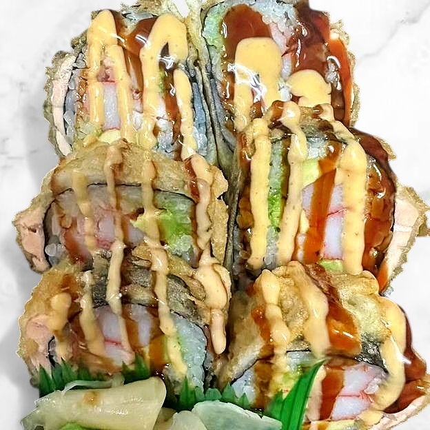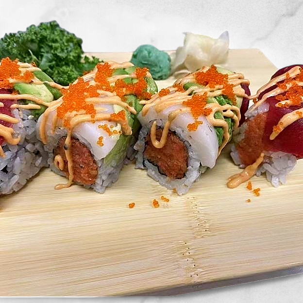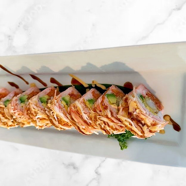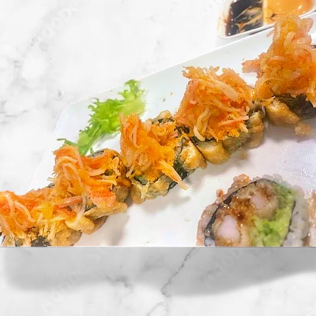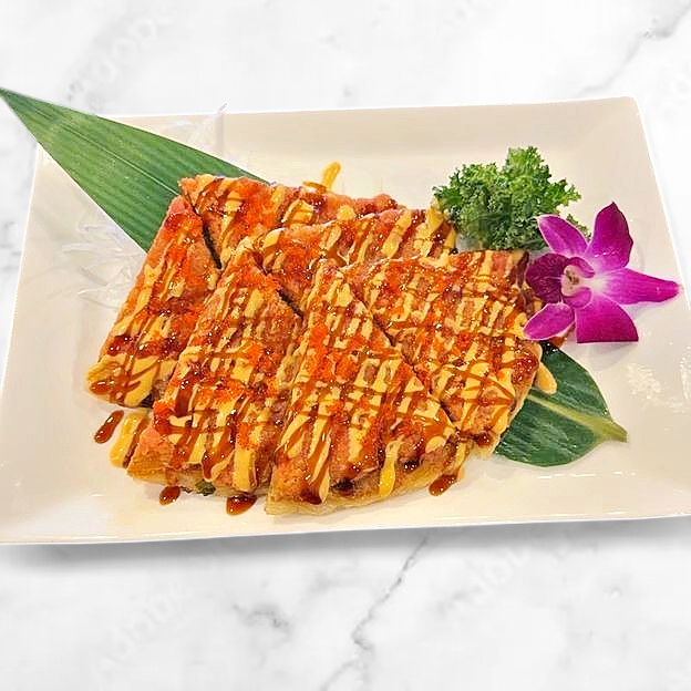 Crispy crabmeat tempura, bottom with lettuce, spicy mayo & eel sauce on the top finish with tuna, salmon, red snapper & ponzu sauce