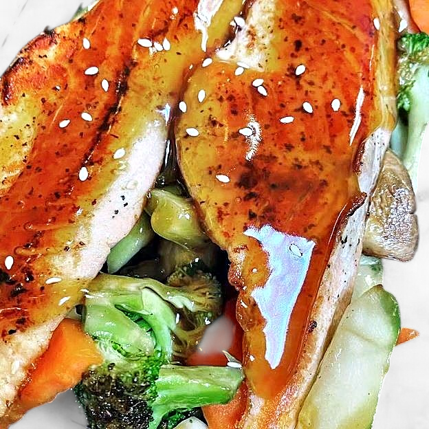 (Chicken, shrimp, or salmon) with fried rice and vegetable
