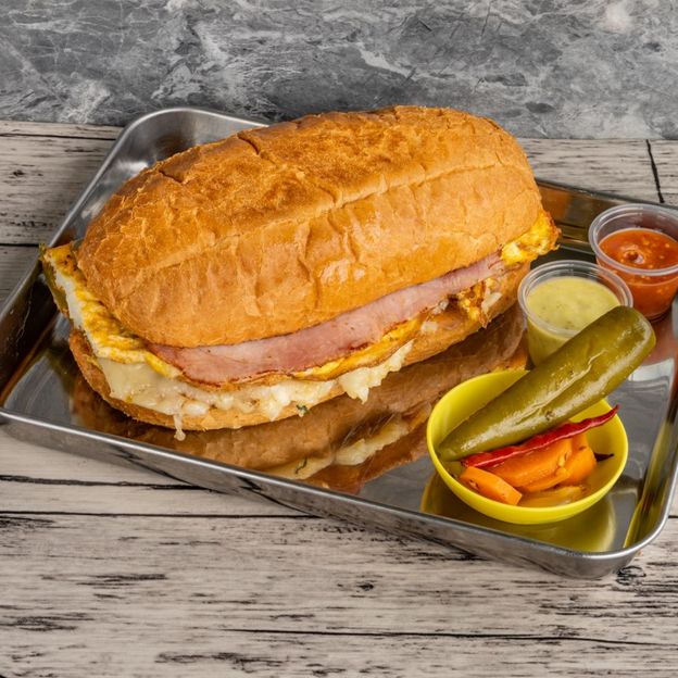 Mexican sandwich, filled with beans, chorizo, eggs, ham and cheese.