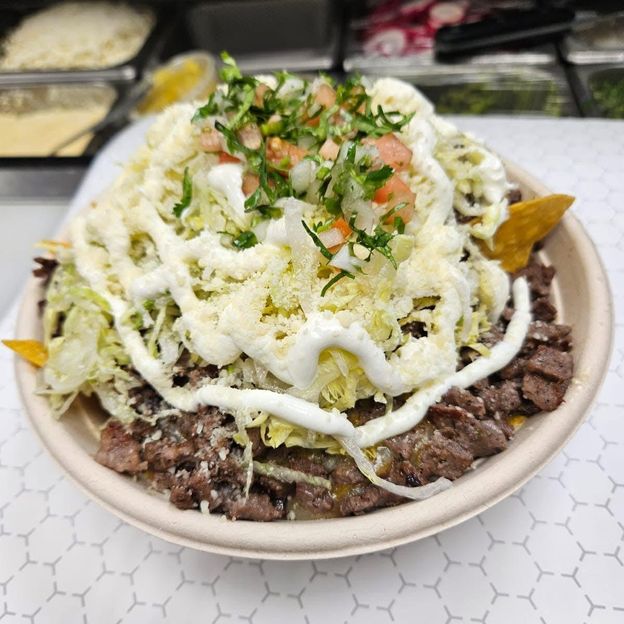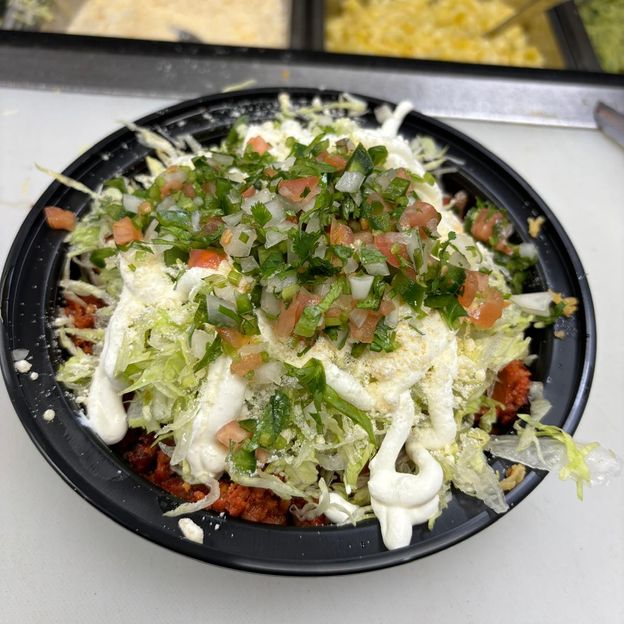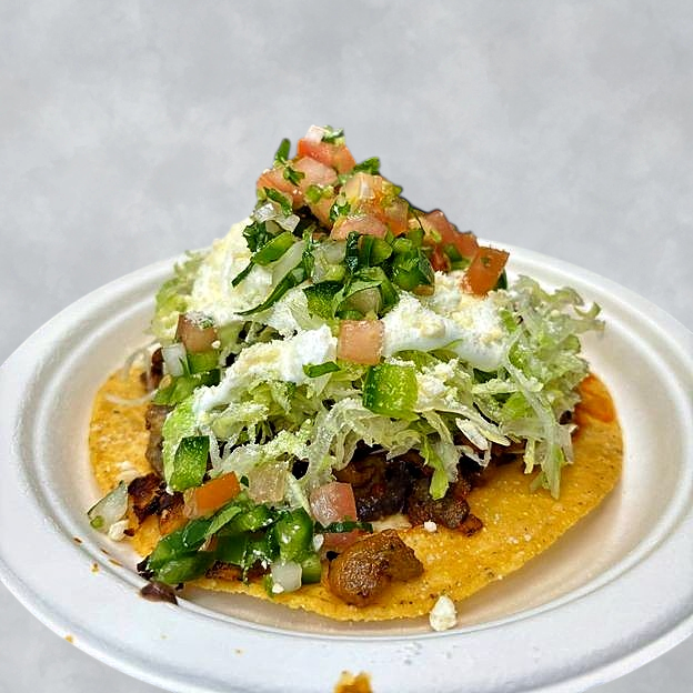 Fried Tortilla with beans, shredded. Iceberg Lettuce, sour Cream, grated Cheese, Choice of protein