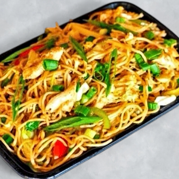 Stir-Fried Noodles Tossed with Tender Chicken Strips, Fresh Vegetables, and Savory Sauces.