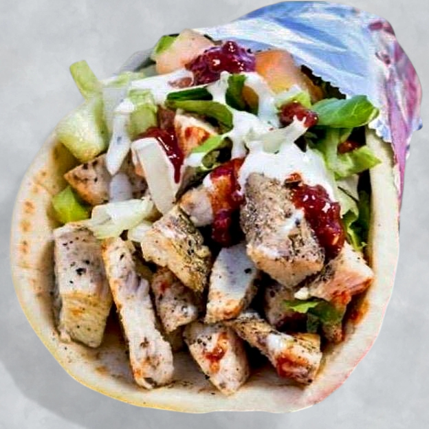 Marinated chicken breast, thinly sliced, wrapped in pita bread with tomatoes and onions.