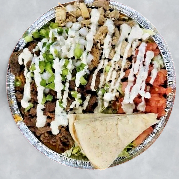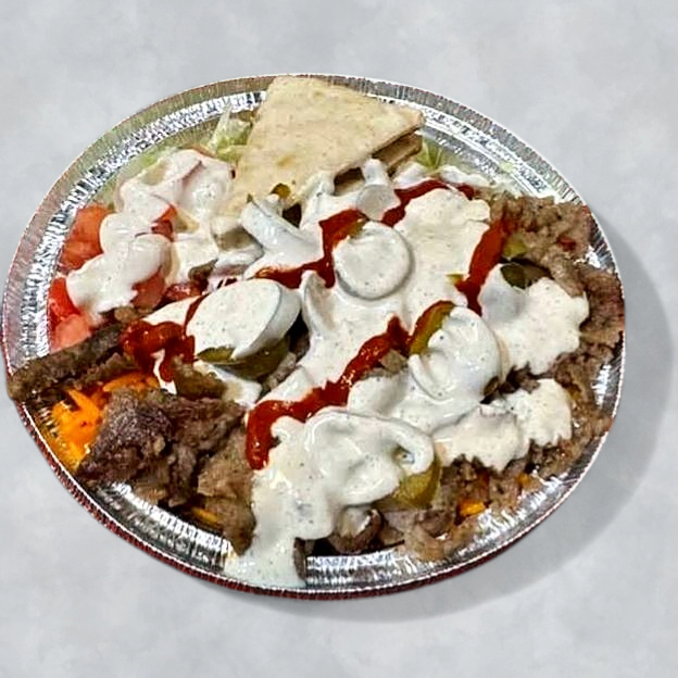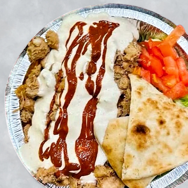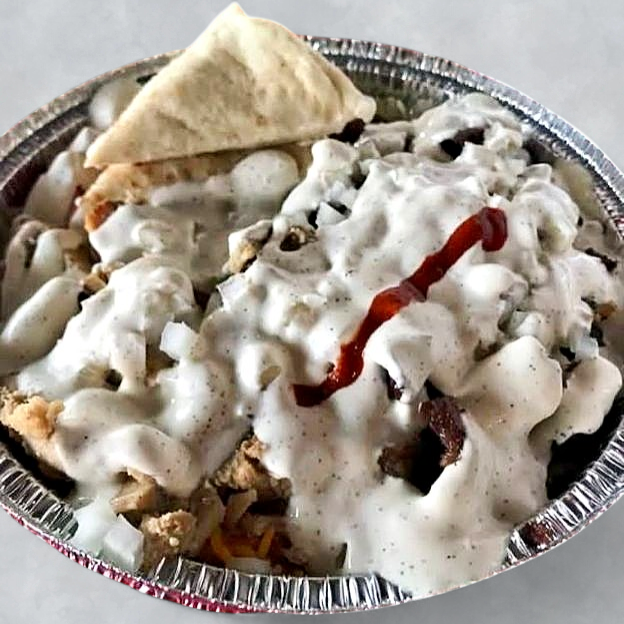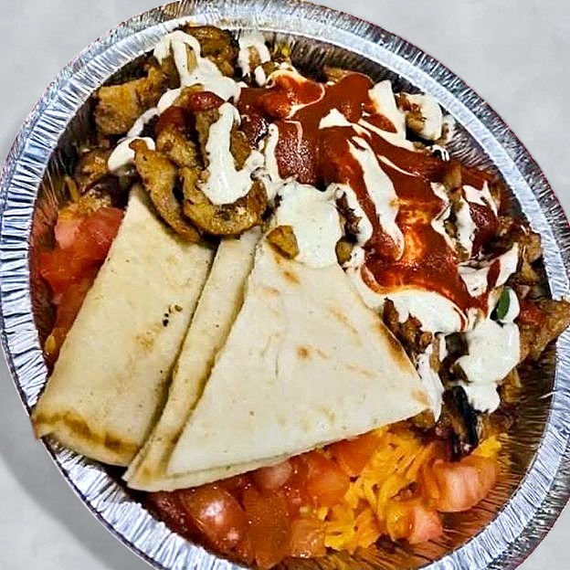 Tender combo meat served over fragrant rice, topped with fresh lettuce, tomato, and cucumber, finished with our famous white sauce & spicy sauce.