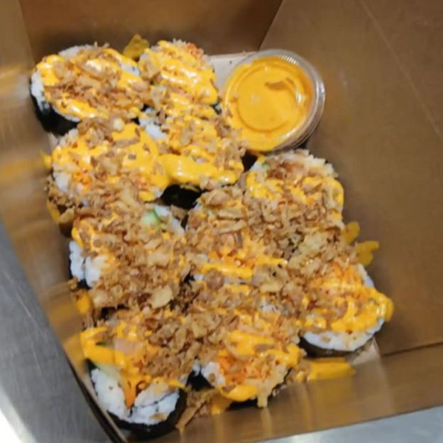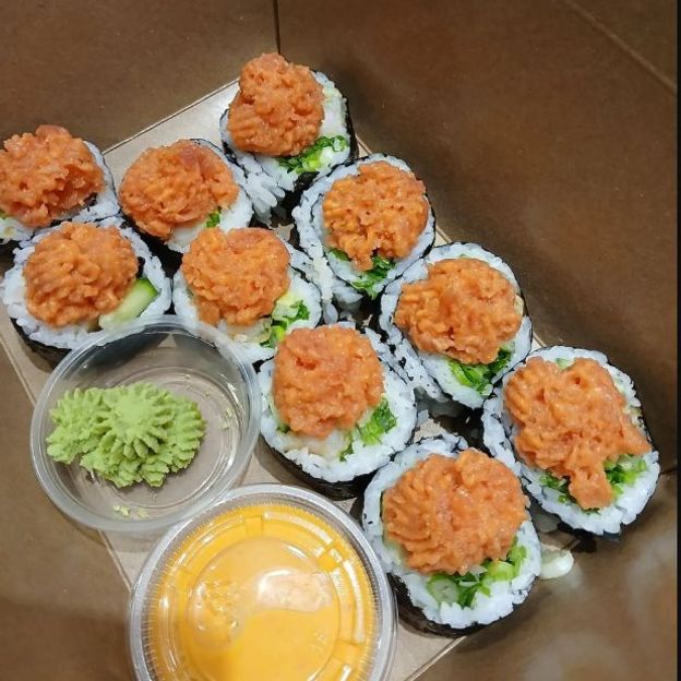 Shrimp tempura, spicy tuna, avocado, cucumber, mango, yum yum sauce