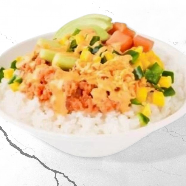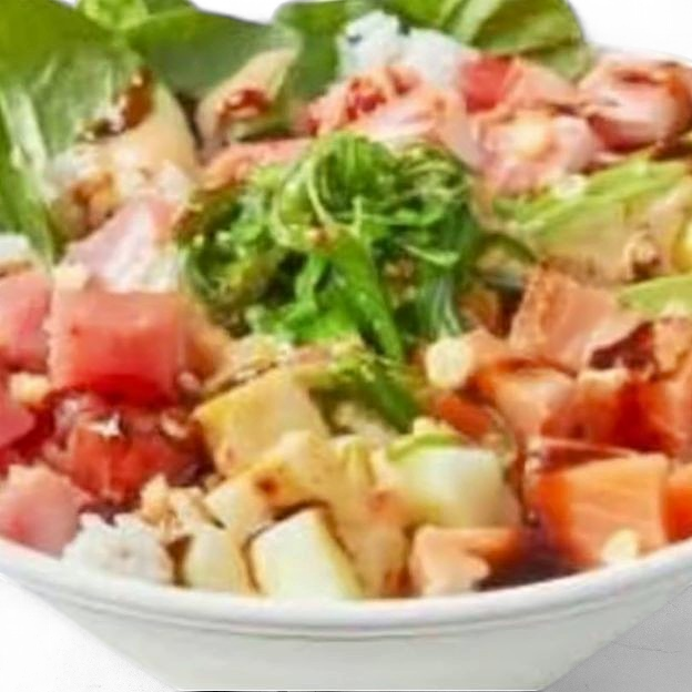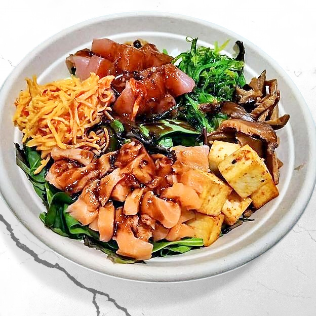Ahi tuna, kani, Norwegian salmon, avocado, diced cucumber, fresh salad blend, seaweed salad, poké sauce, yum yum sauce, crispy rice bits
