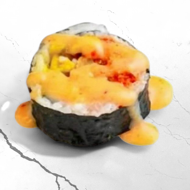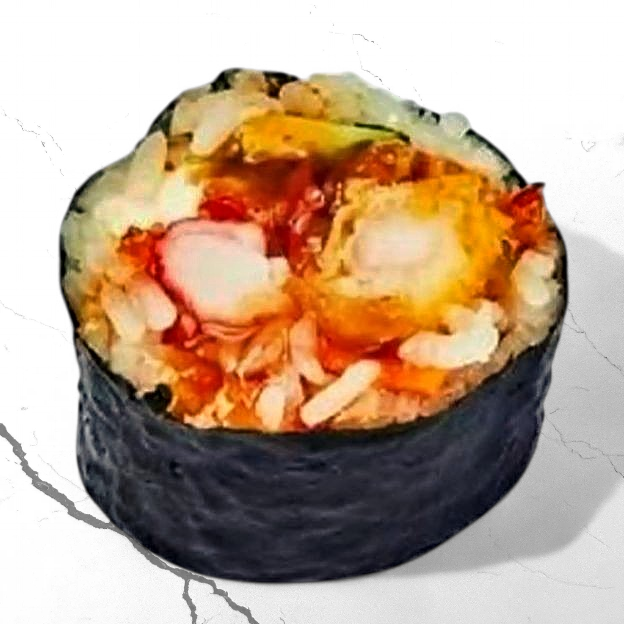 Ebi shrimp, kani, avocado, chili powder, crunchy onion, jalapeño, Spicy Mayo dressing