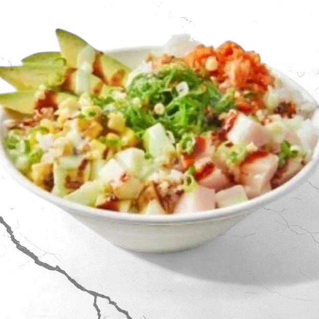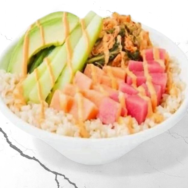 Double portion of ahi tuna, avocado, diced cucumber, fresh salad blend, poké sauce, crispy rice bits, green onion