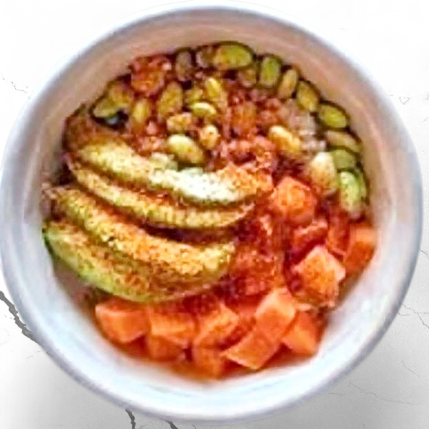 Red snapper, spicy ahi tuna, avocado, diced cucumber, mango, seaweed salad, cucumber wasabi dressing, poké sauce, crispy rice bits, green onion