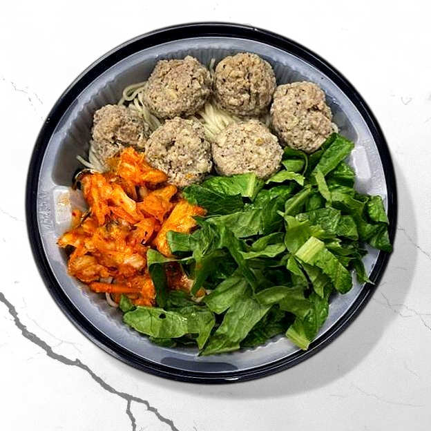 Beef-flavored meatballs, kimchi,vegetables,ramennoodles,Japanese-flavored soup