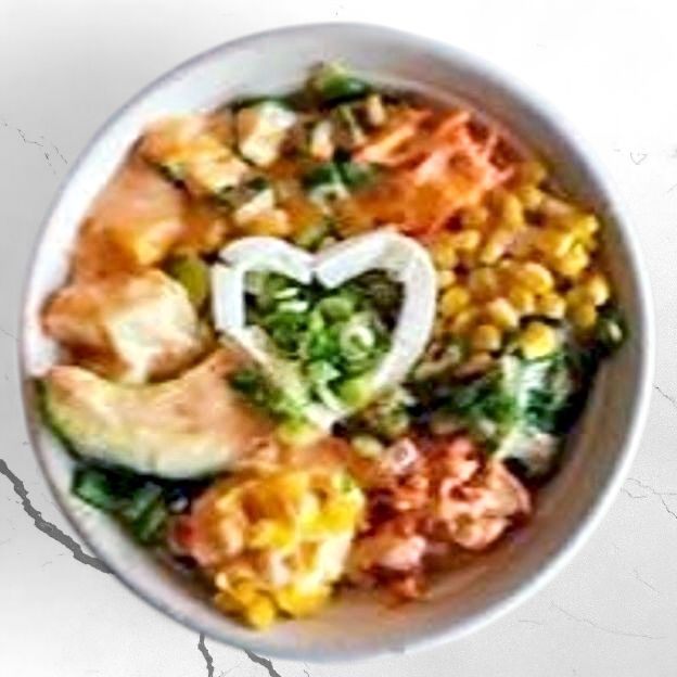 Grilled chicken pieces,sweet corn,vegetables,ramennoodles,Janpanese-flavored soup