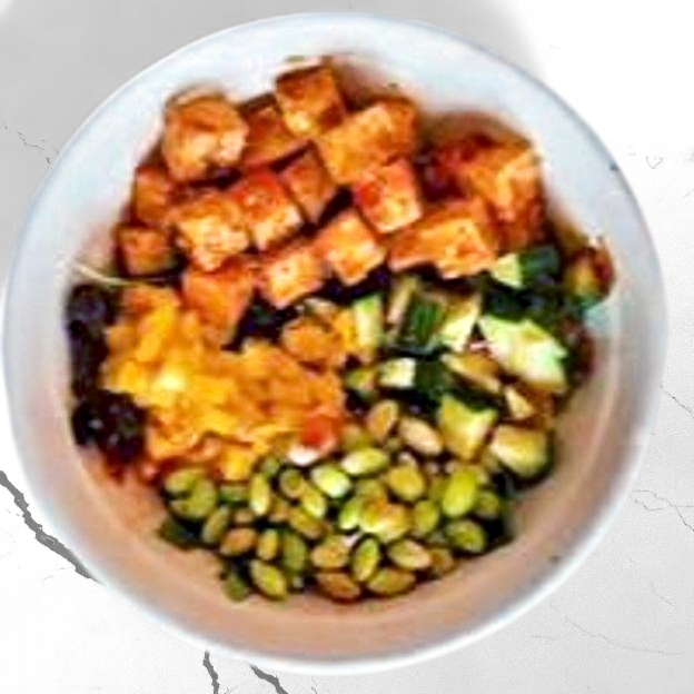 Double portion of agé tofu, cucumber, edamame, mango, poké sauce, sweet chili sauce
