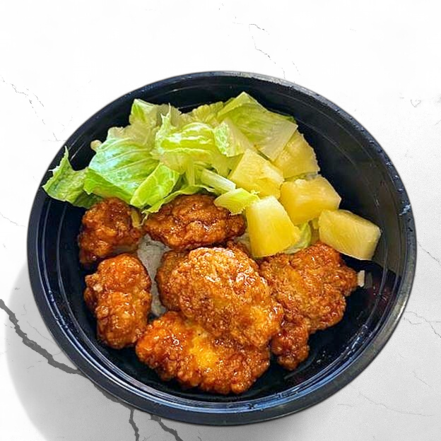 Crispy fried chicken pieces, General Tso's sauce,pineapple,vegetables,sushi rice.