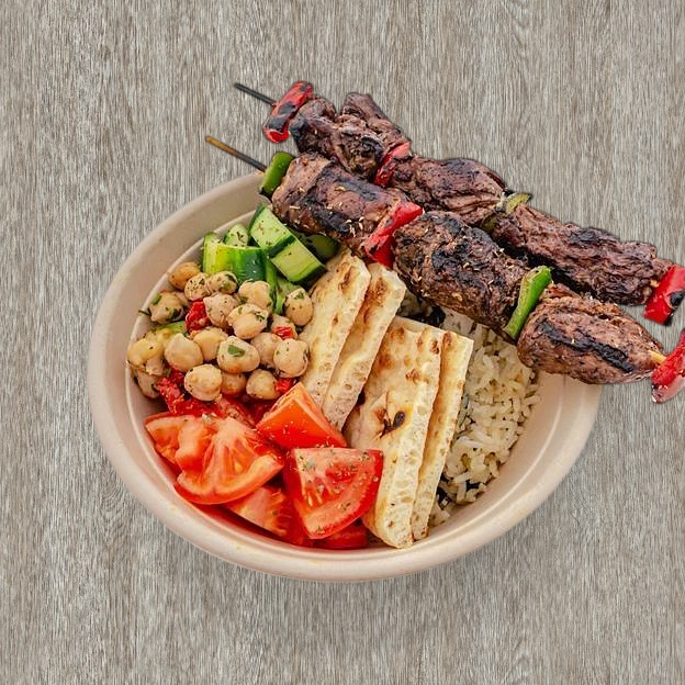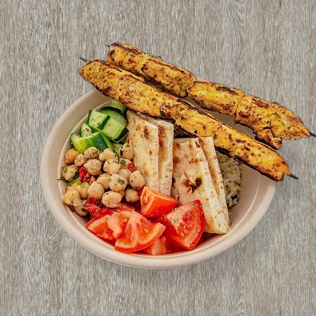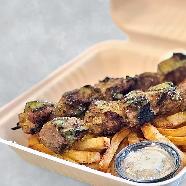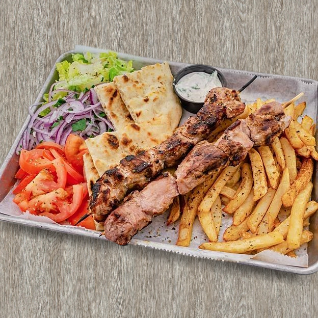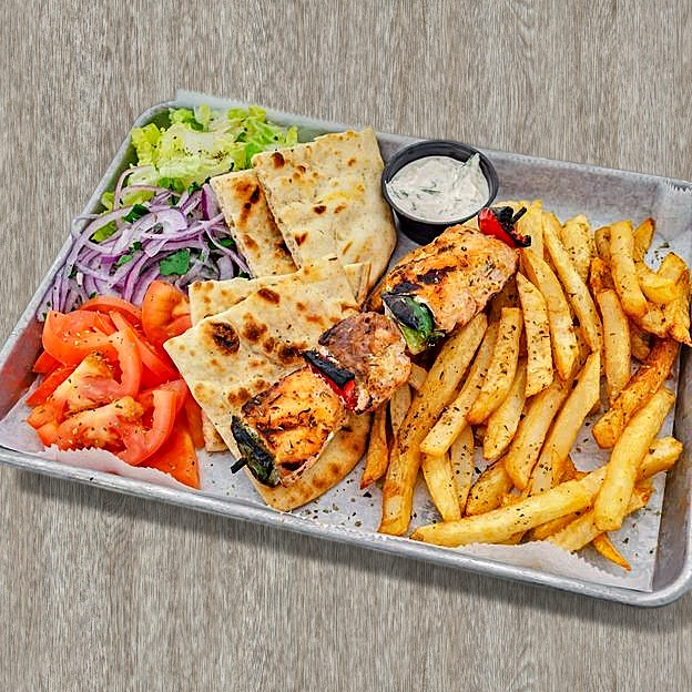 choice of any of either chicken or pork skewers w/ fries and a drink