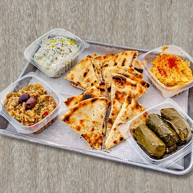 All 3 spreads with dolmades and pita bread