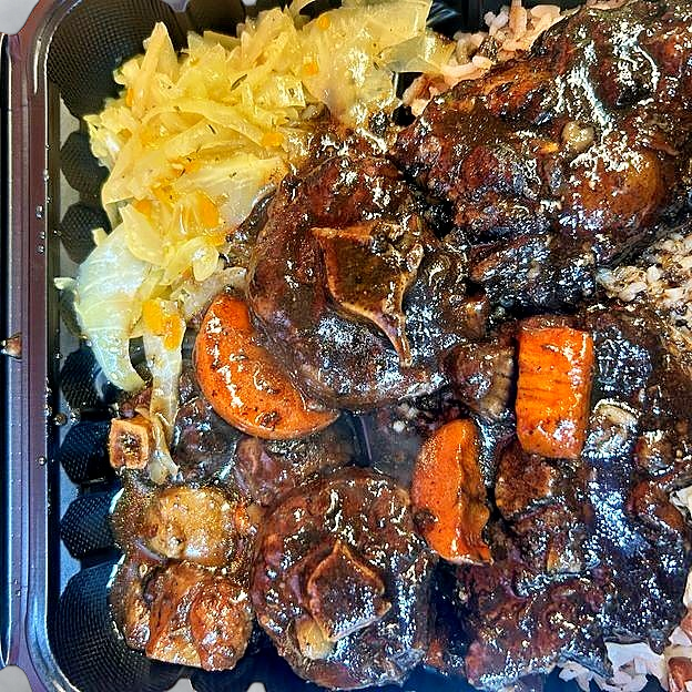 An essential Jamaican dish perfectly seasoned with curry powder and other spices. Served with rice and cabbage.