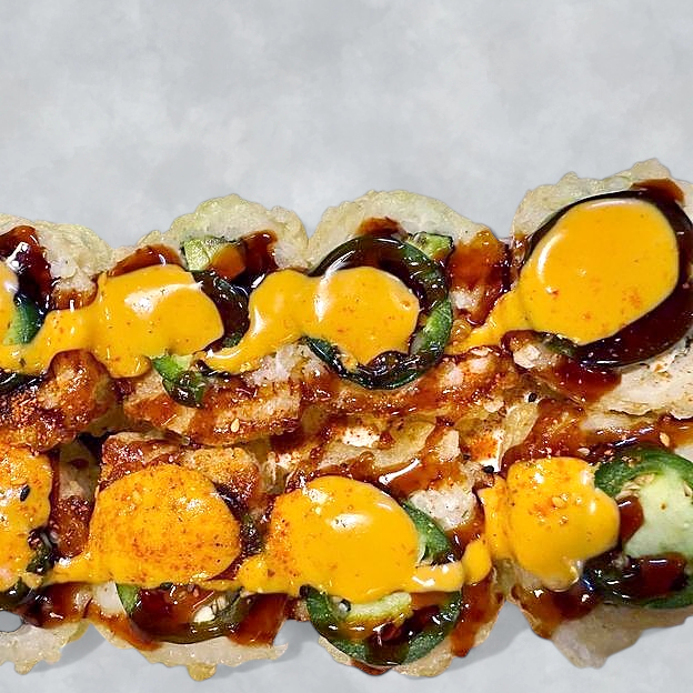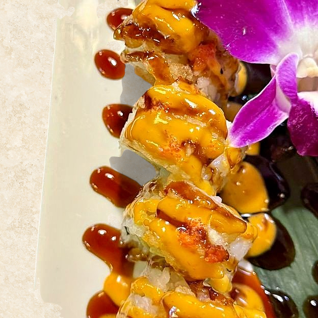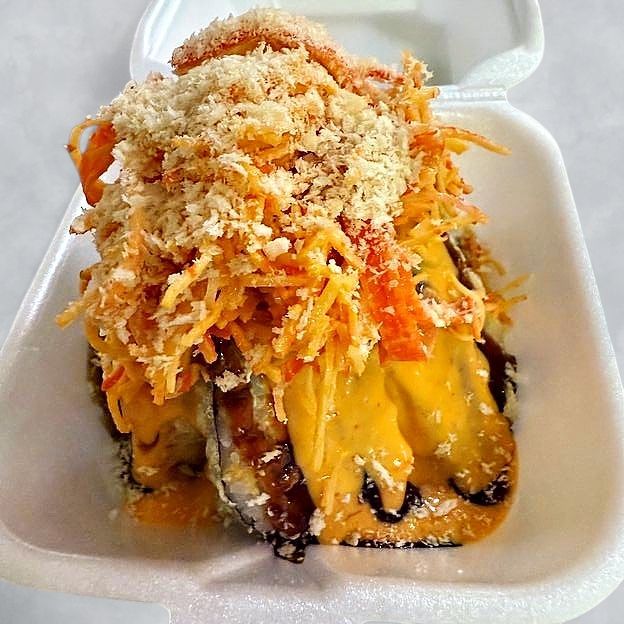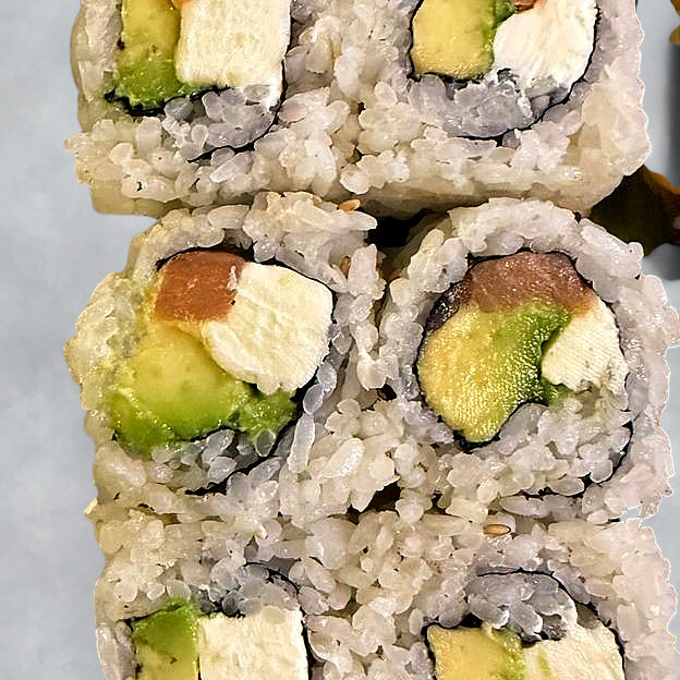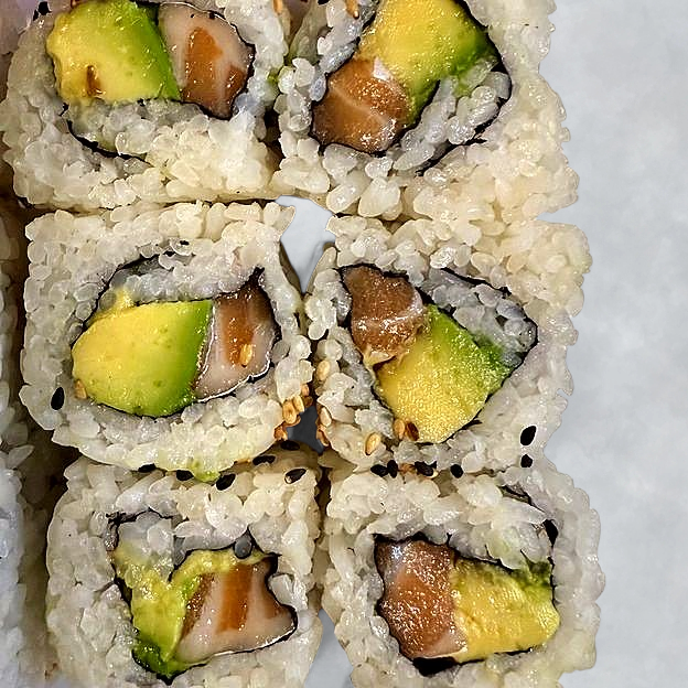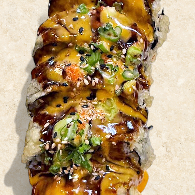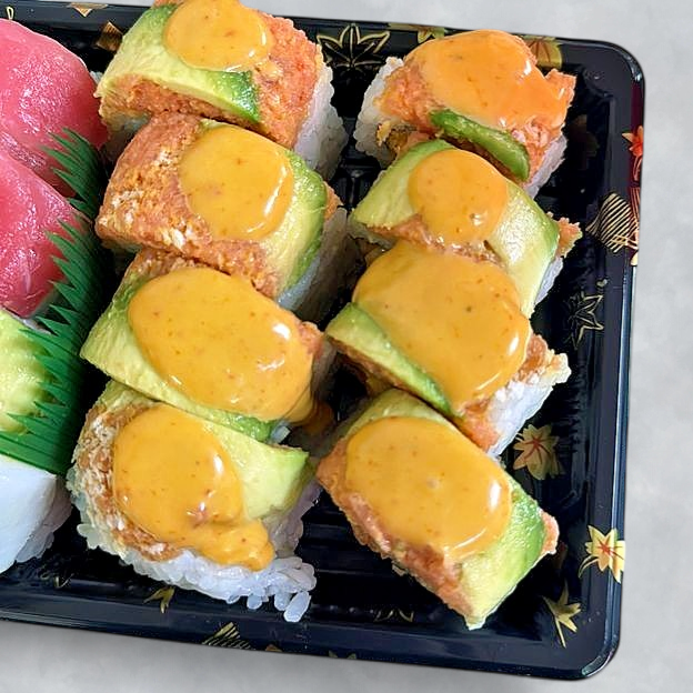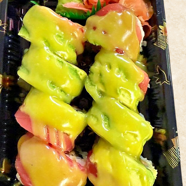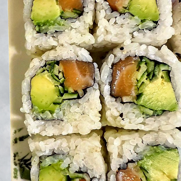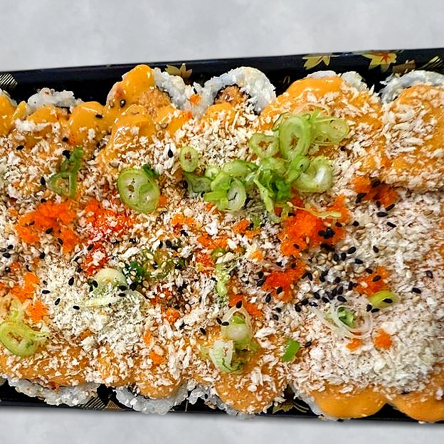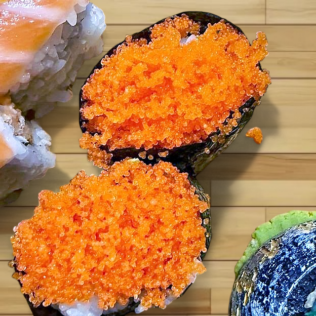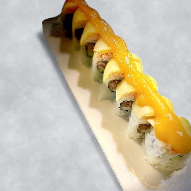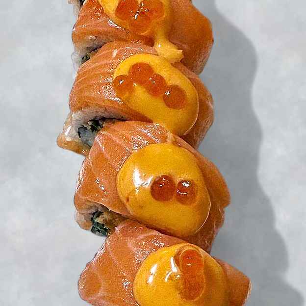 Salmon, cucumber, avocado, cream cheese, and mango inside, topped with tobiko around the outside