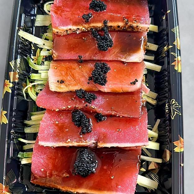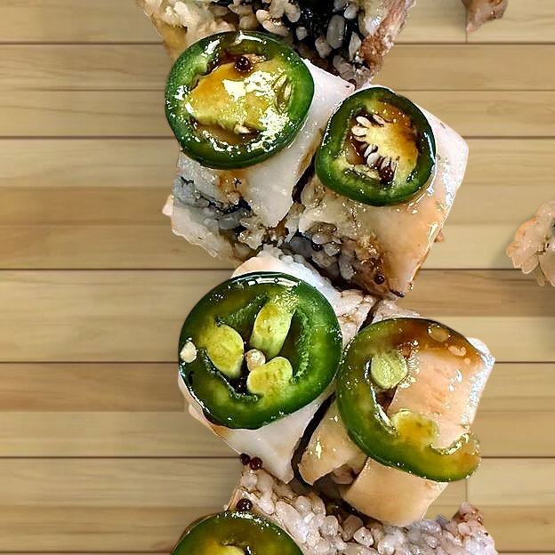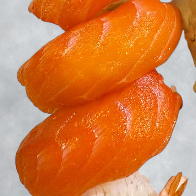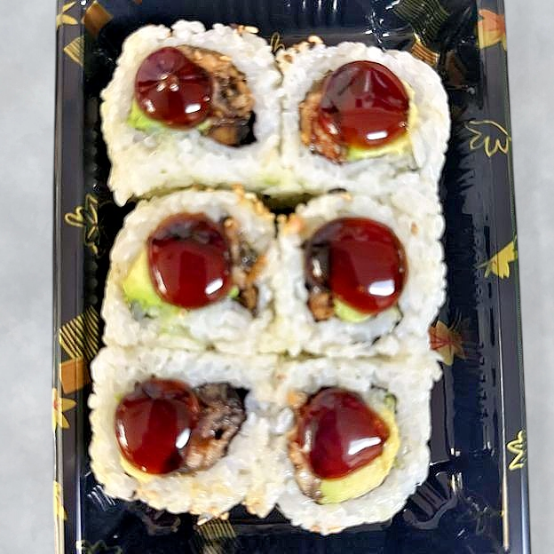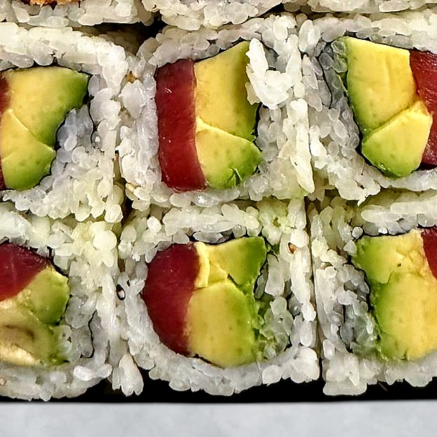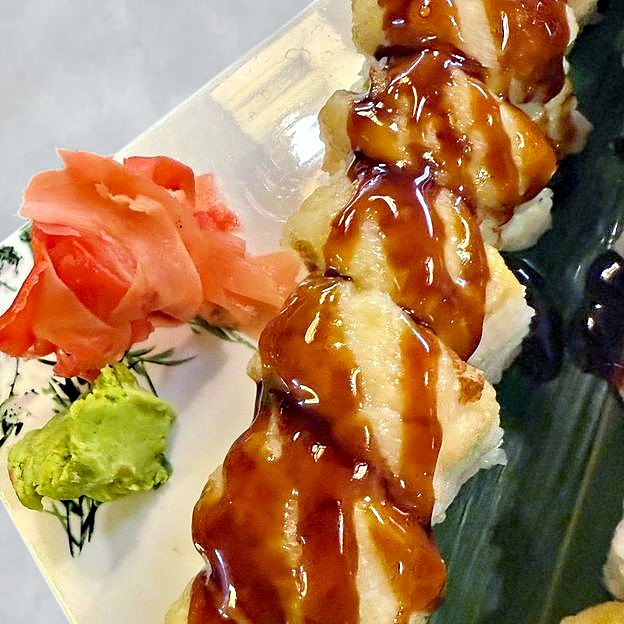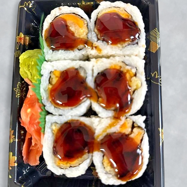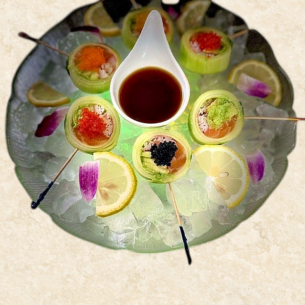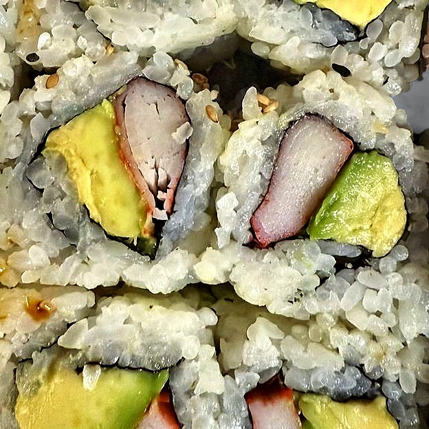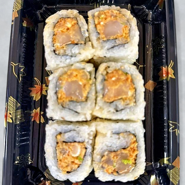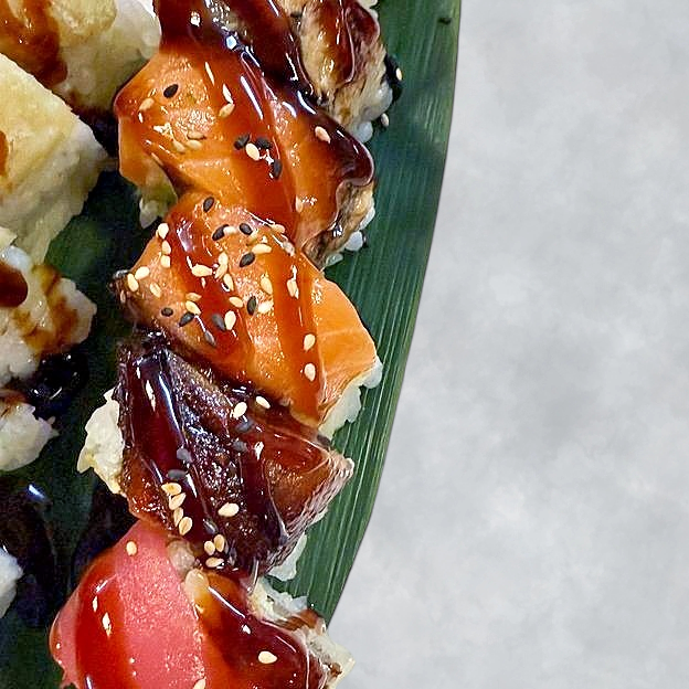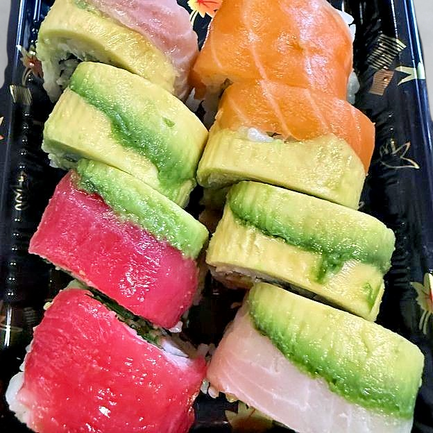 Salmon, cucumber, avocado, cream cheese, and mango inside, topped with tobiko around the outside
