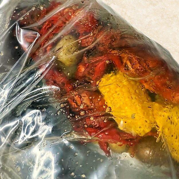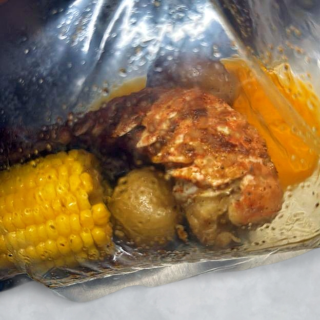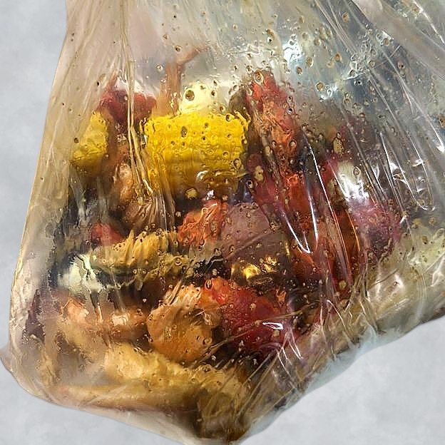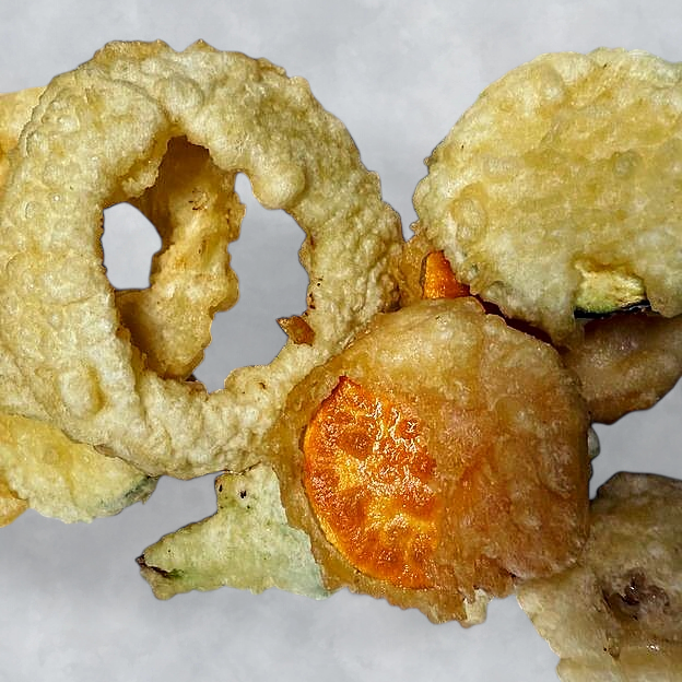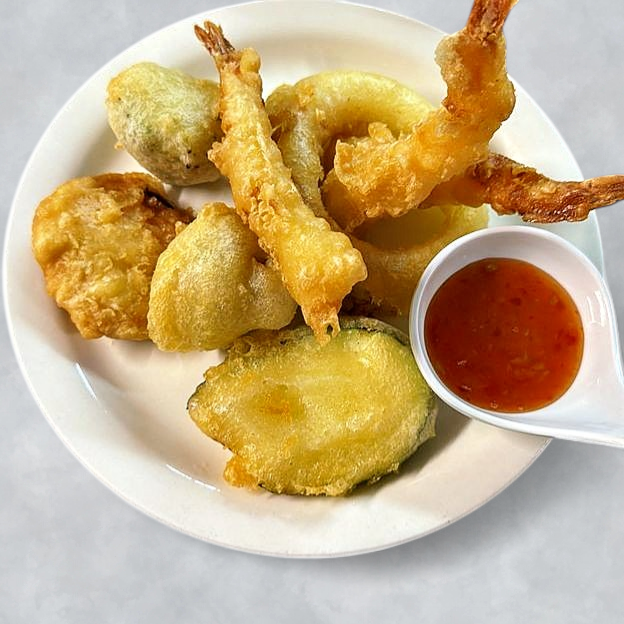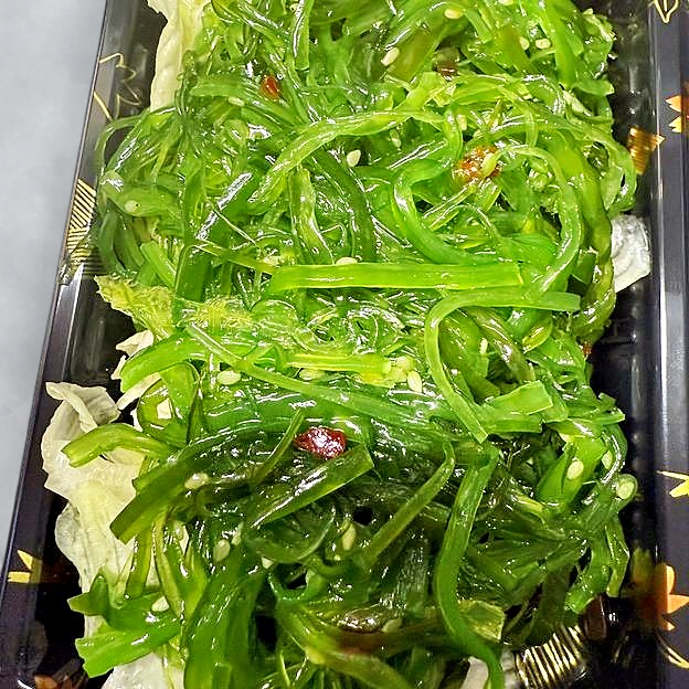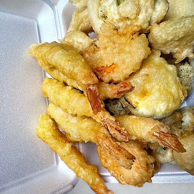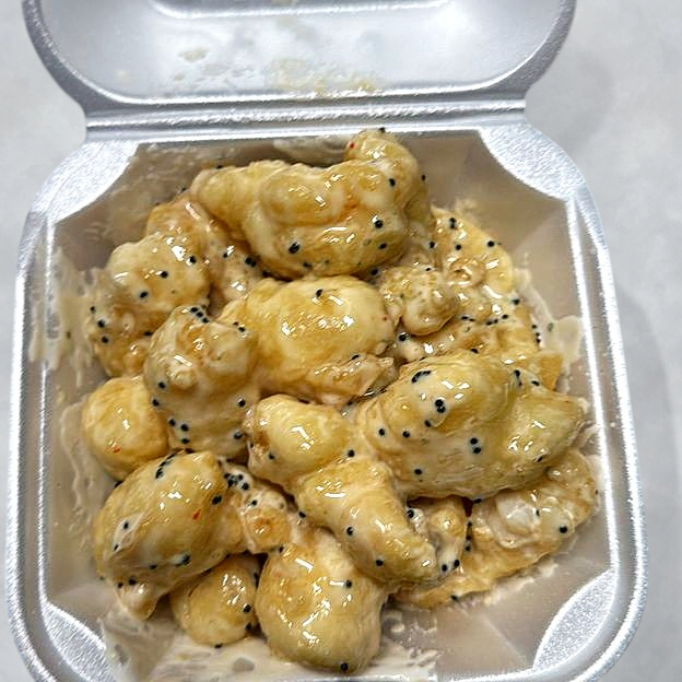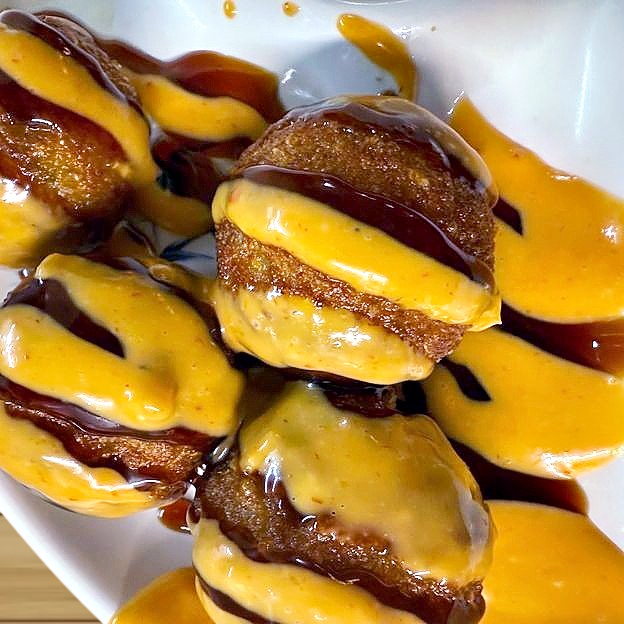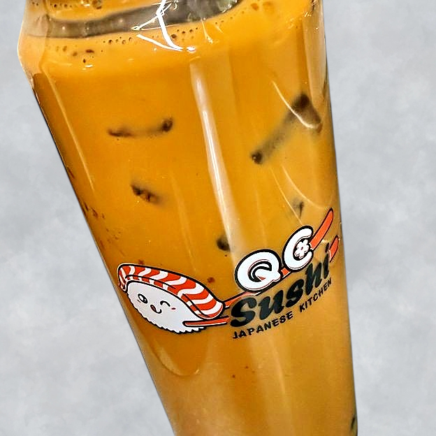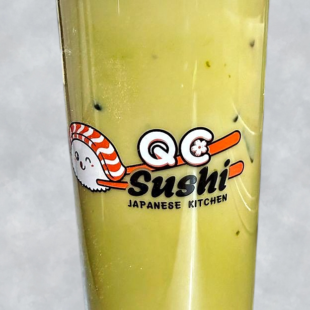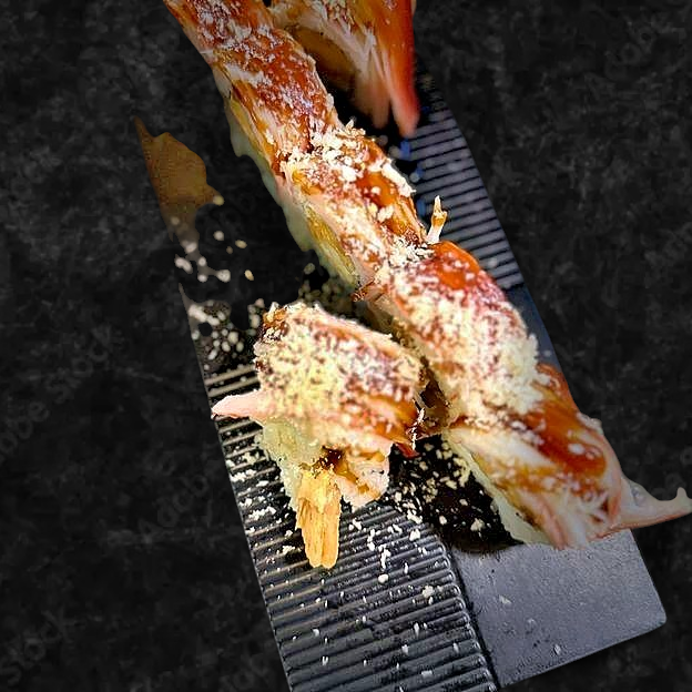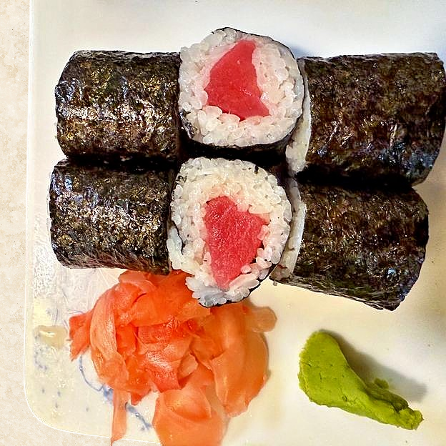 Salmon, cucumber, avocado, cream cheese, and mango inside, topped with tobiko around the outside
