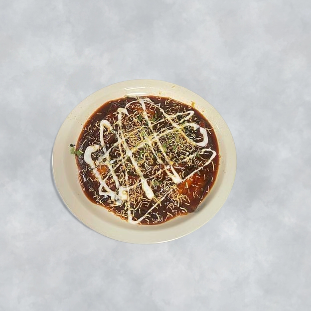 Flour crisp, potatoes and peas garnished with yogurt, tamarind sauce and mildly spiced chickpeas.