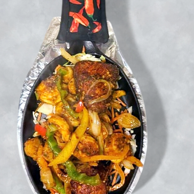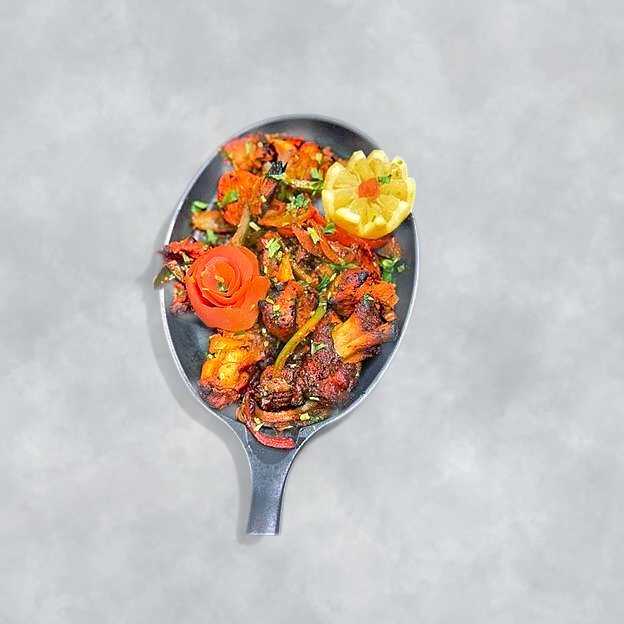 Cubes of chicken breast sautéed with soy sauce, onions, green chilies, herbs and exotic spices.