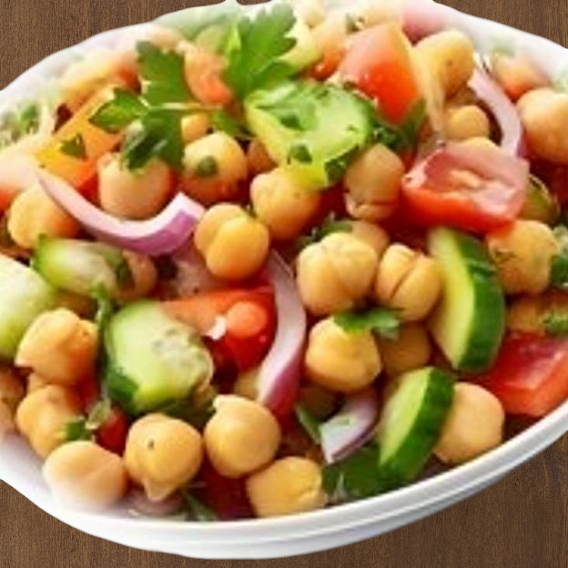 CHICKPEAS, CUCUMBERS, BELL PEPPER, TOMATOES, ONIONS, OLIVES, PINTO BEANS, PICKLES, CORN, RED ONION, TOPPED WITH TORTILLA CHIPS AND A PITA