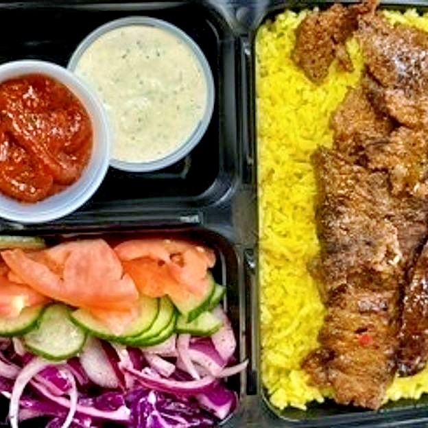 Savory slices of seasoned meat served with fluffy rice, crisp salad, and a side of garlic sauce, hummus, red pepper sauce,accompanied by warm pita bread , saffron rice and fries for a balanced, hearty meal.