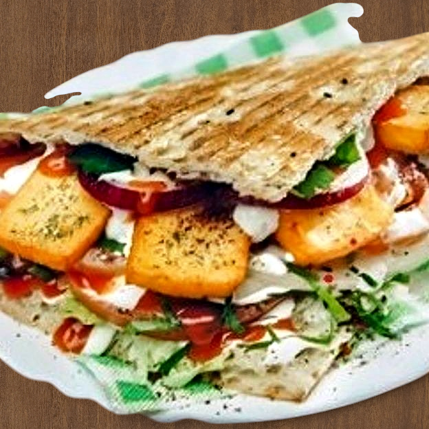 Fried Golden Halloumi cheese inside warm, fluffy home-made pita, layered with fresh veggies, creay garlic saltify secret sauces.