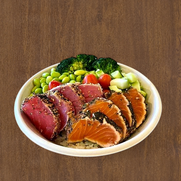 Steamed broccoli, tomato, edamame, cucumber, tuna tataki, salmon tataki, poke dressing, sesame seed