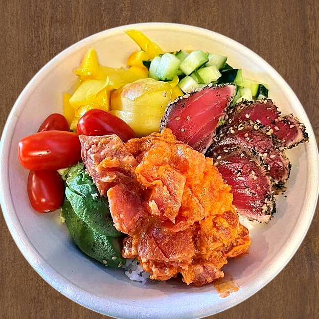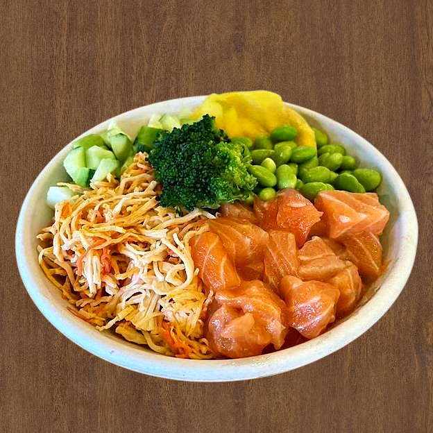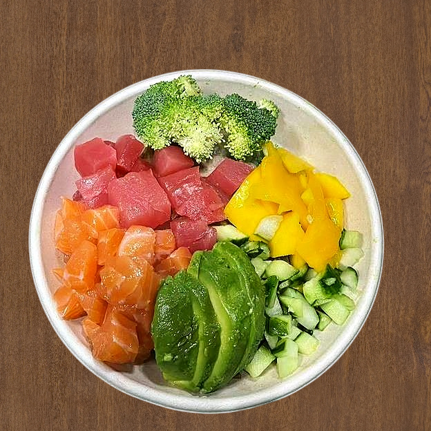 Cucumber, mango, avocado, steamed broccoli, tuna, salmon, poke dressing, crispy onion