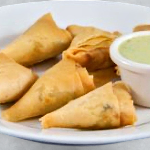 Crispy pastry pockets filled with spiced potatoes and peas, served with a side of mint yogurt sauce.