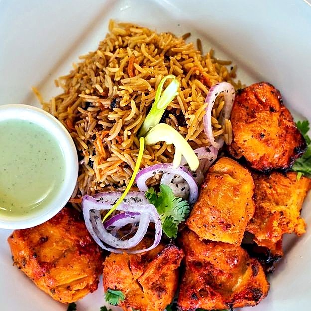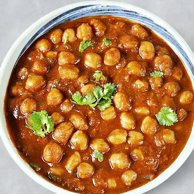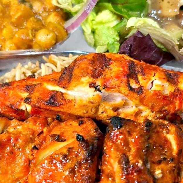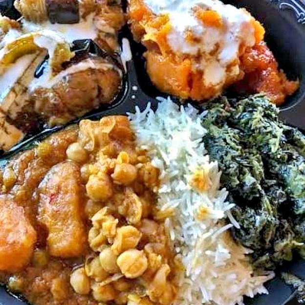 Tender lamb and chicken pieces served with spiced chickpeas, sautéed spinach, and sliced red onions.