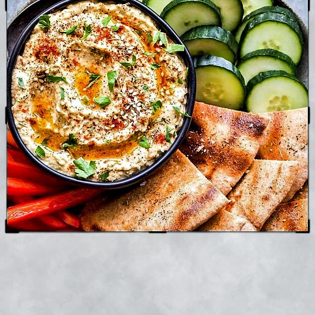 Creamy roasted eggplant dip garnished with herbs and spices, served with slices of fresh cucumber, red pepper sticks, and warm pita bread.