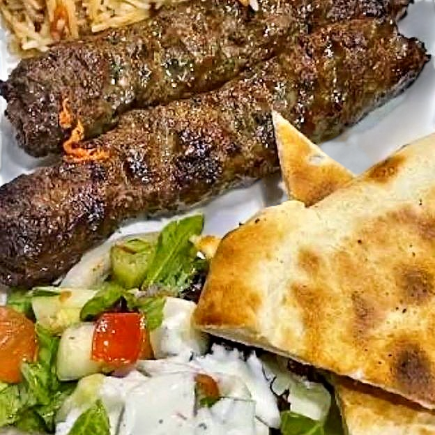 Grilled spiced ground meat served with seasoned rice, fresh salad topped with creamy dressing, and warm pita bread.