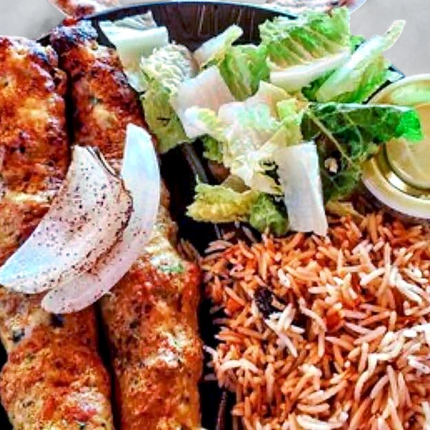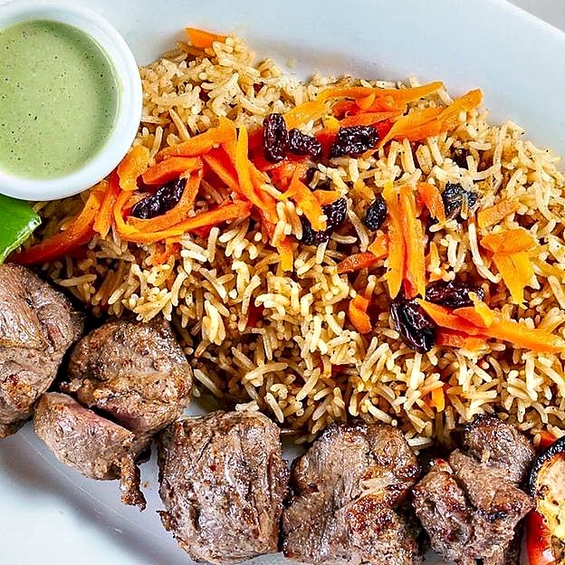 Tender lamb kabobs served with fragrant spiced rice, garnished with shredded carrots and raisins, accompanied by a green dipping sauce.
