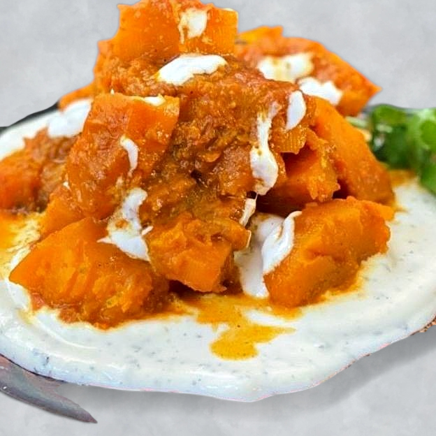 Tender pumpkin chunks in a rich, spiced sauce, garnished with a yogurt drizzle and fresh cilantro.