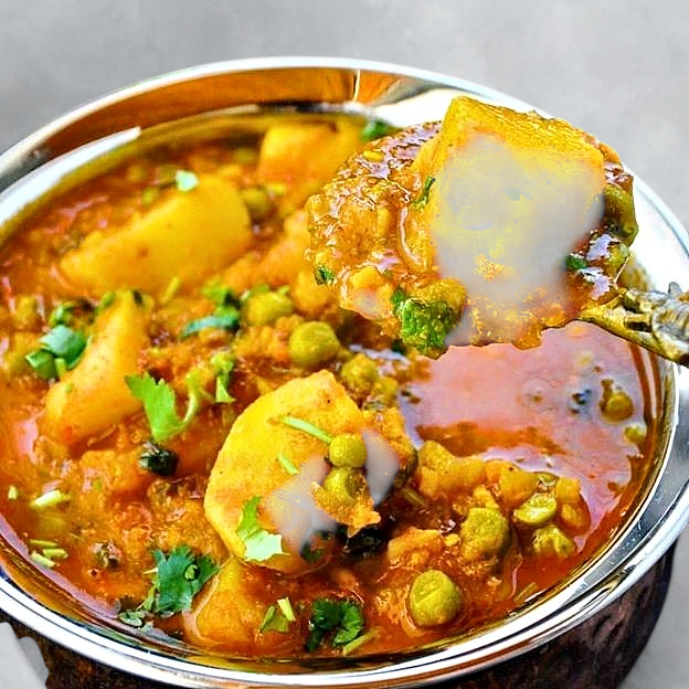 Tender potatoes and green peas simmered in a spiced tomato-based curry sauce, garnished with fresh cilantro.
