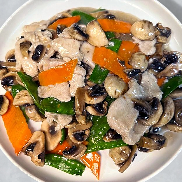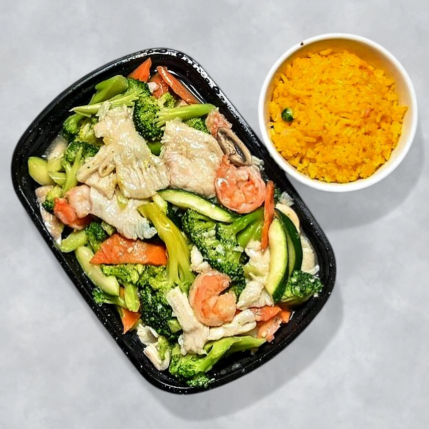 Jumbo shrimo & white meat chicken w. vegetable in white sauce