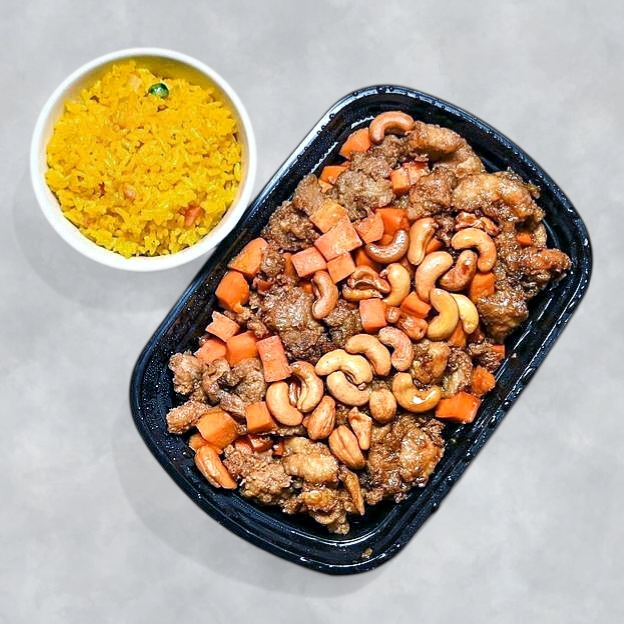 Lightly battered fried prawns served w. grand Marnier coconut sauce and cashew nuts