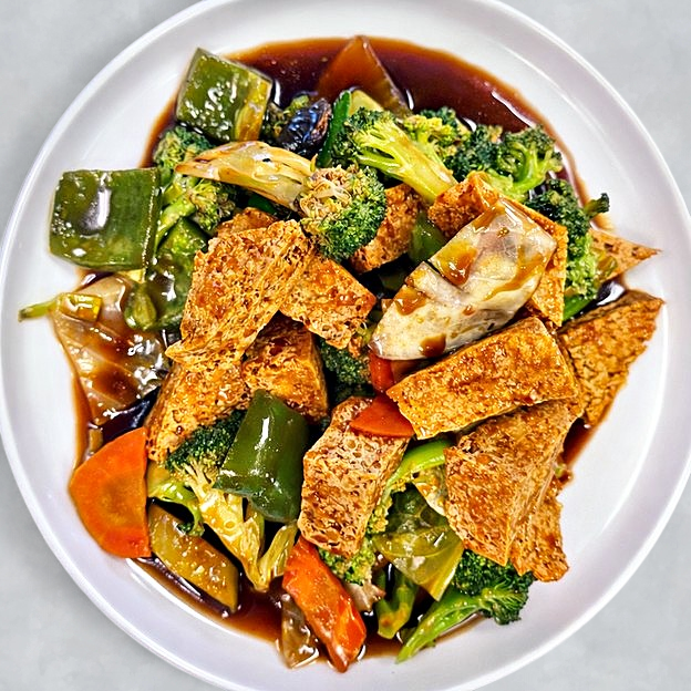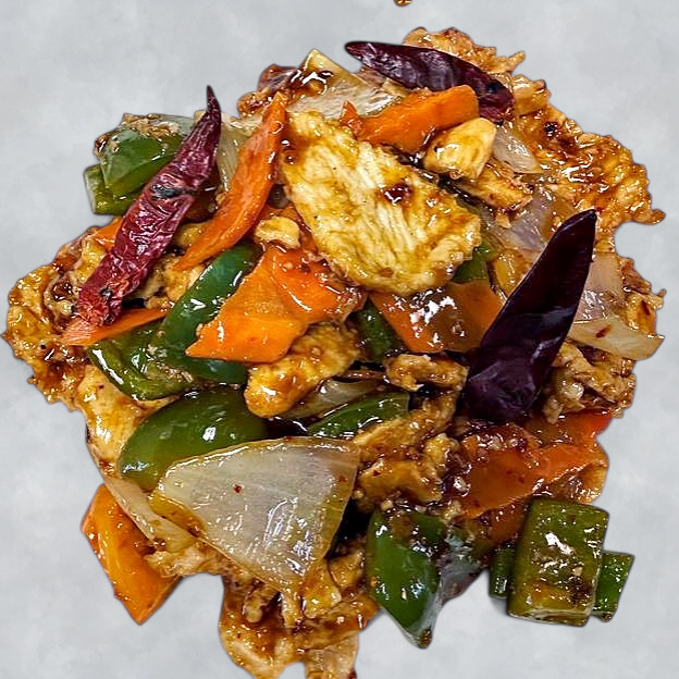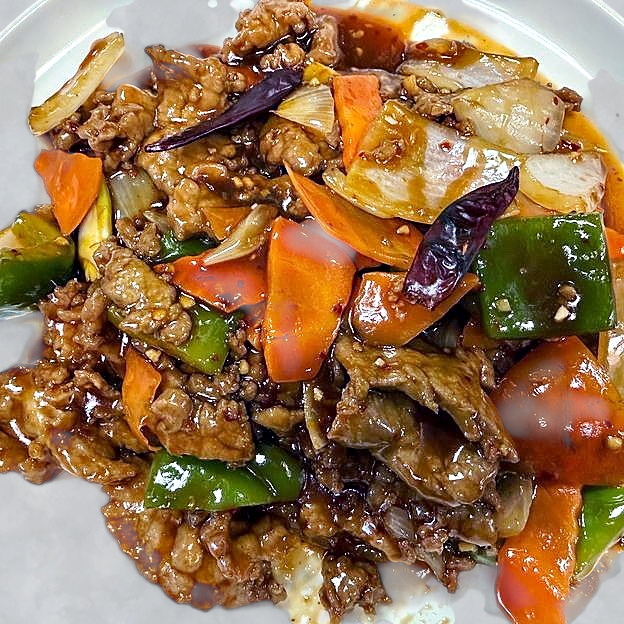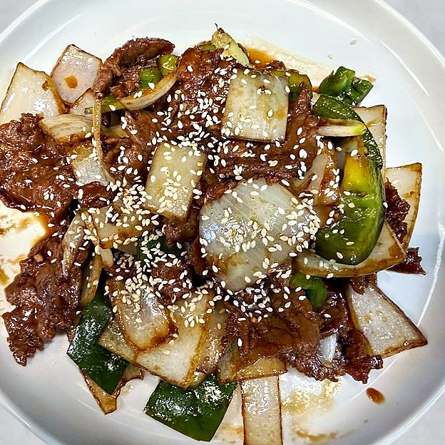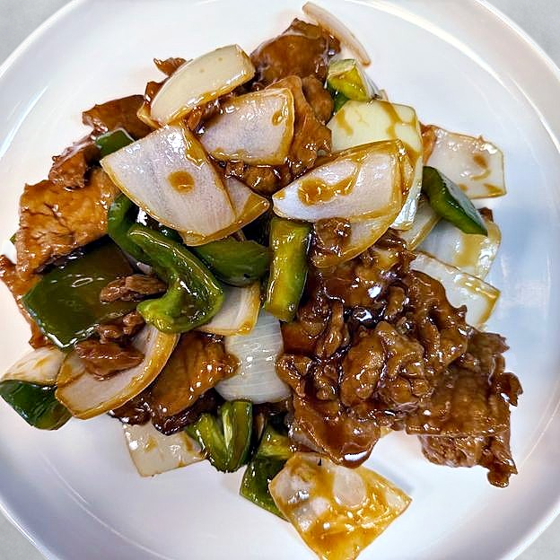 Flank steak,sauteed with bell peppers,onions in a sweet teriyaki sauce