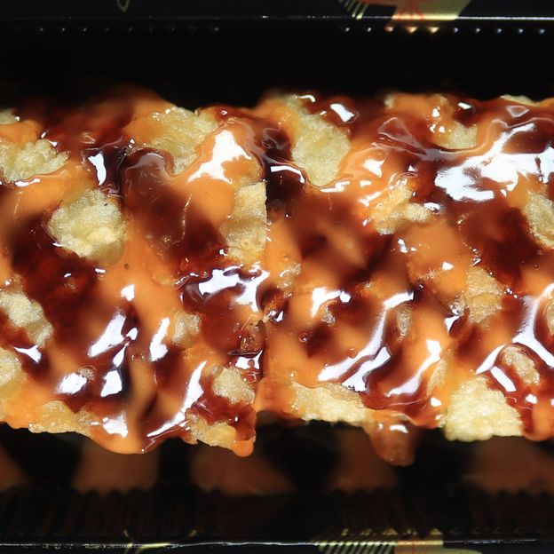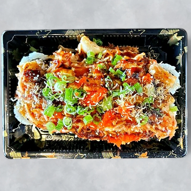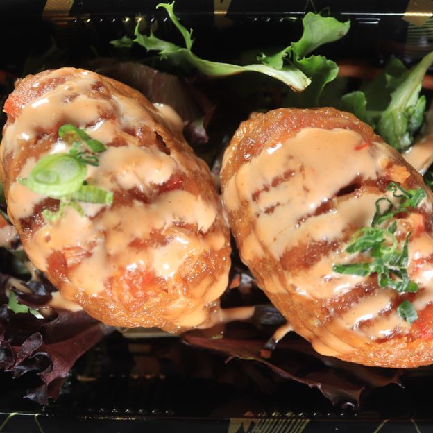 Sushi rice in sweetened bean curd, topped with spicy tuna