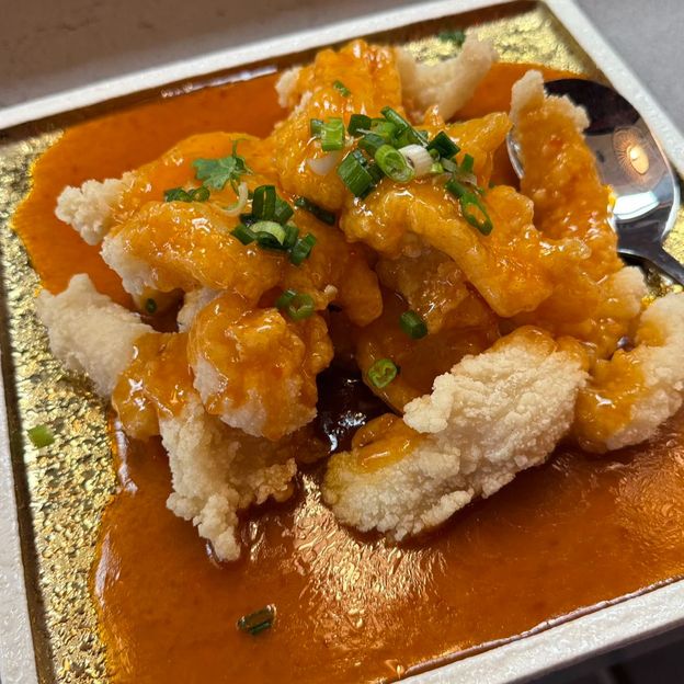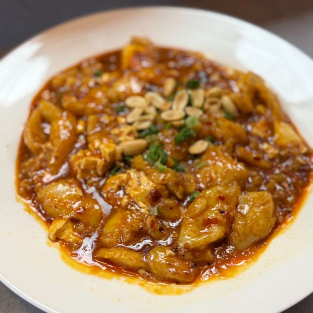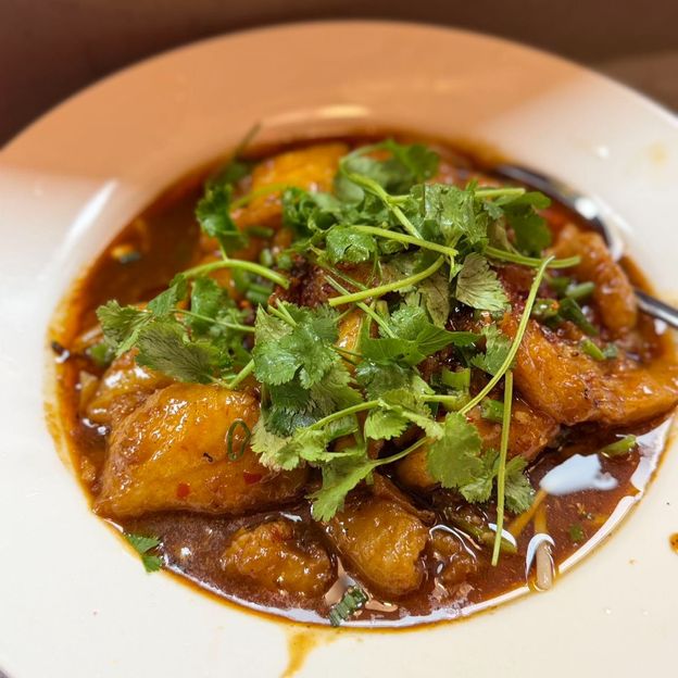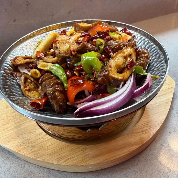 Spicy grilled whole fish with lotus root, cabbage, bean sprouts, tofu, wood ear mushroom, cilantro, and sesame seed