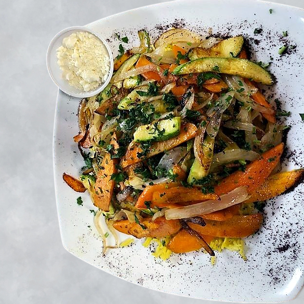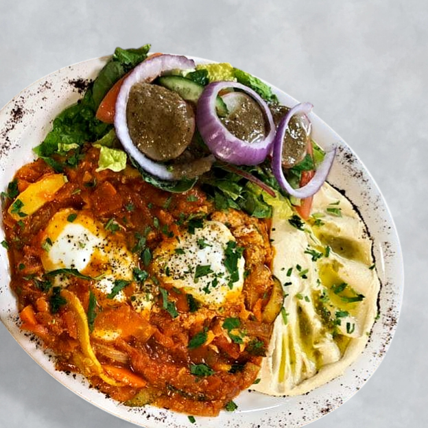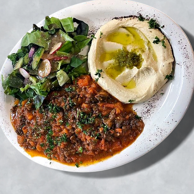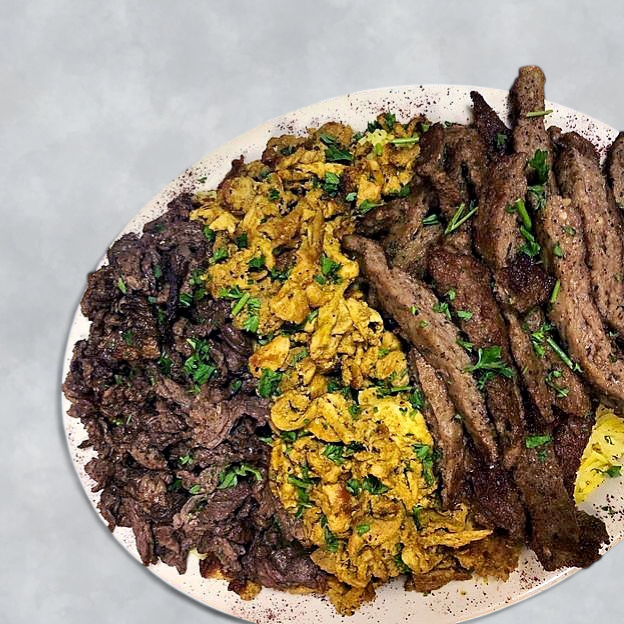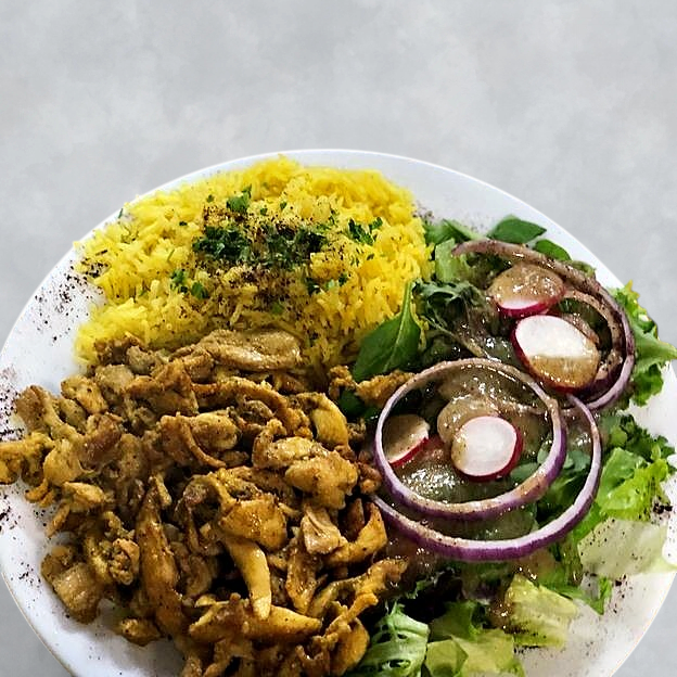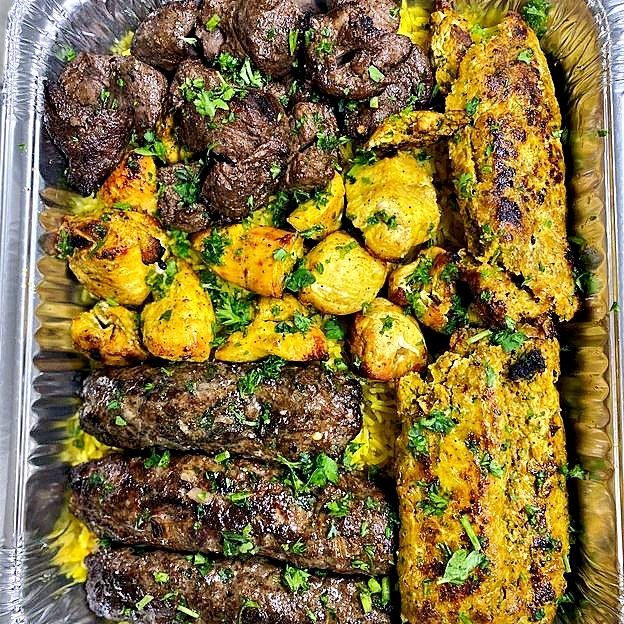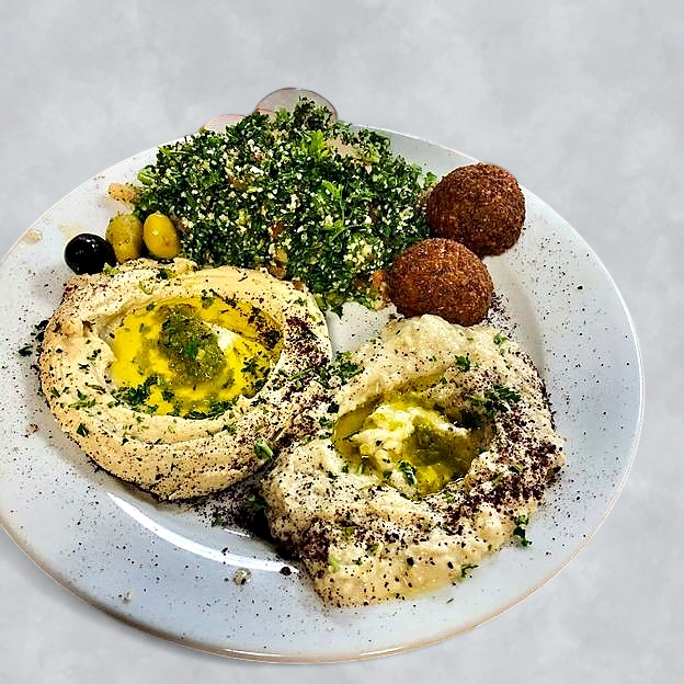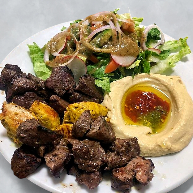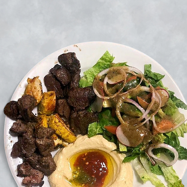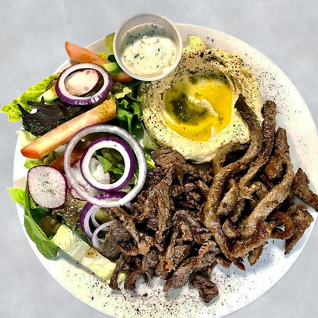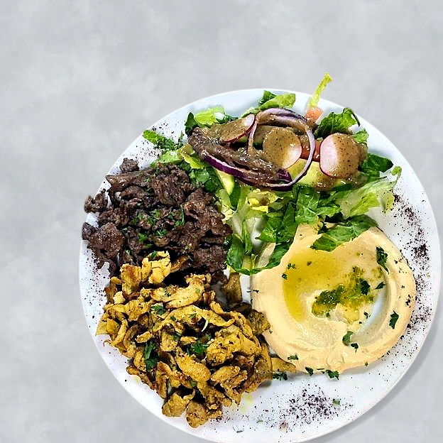 Chicken Shawarma, Beef Shawarma and Gyros. Served with hummus, baba Ganuj, rice, salad and fries.