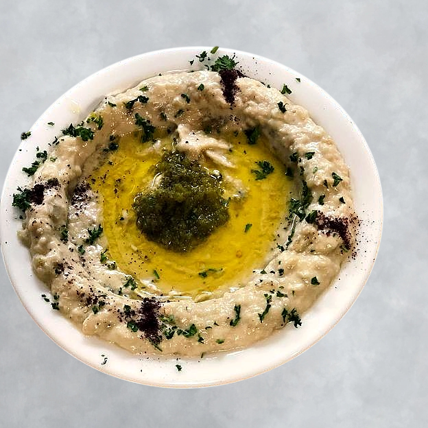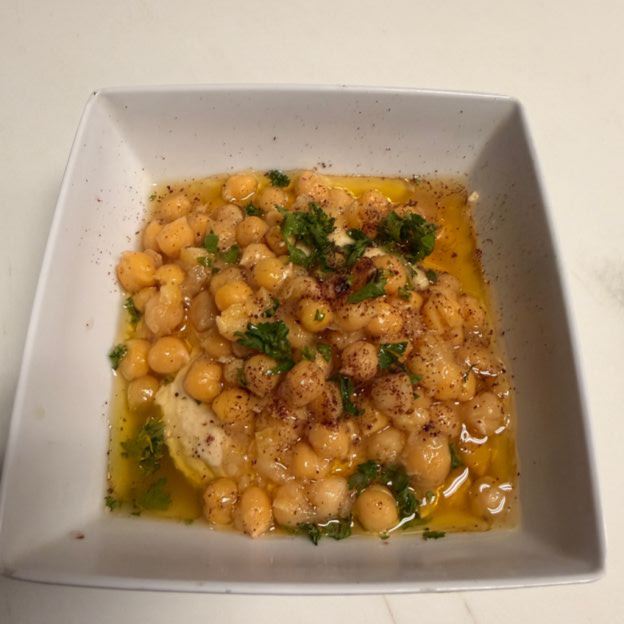 Whole cooked chick peas and hummus with hot pepper and garlic.
