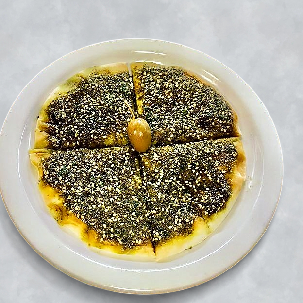 Ground thyme, oregano, sesame seed and sumac with olive oil baked baked on a pita.