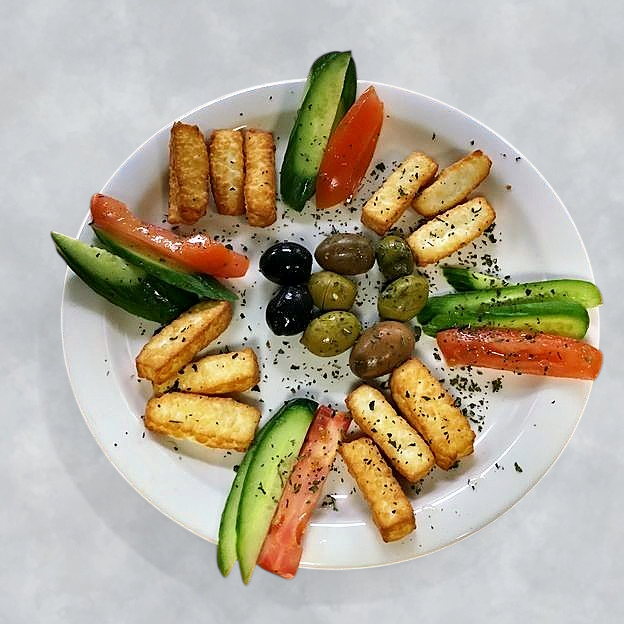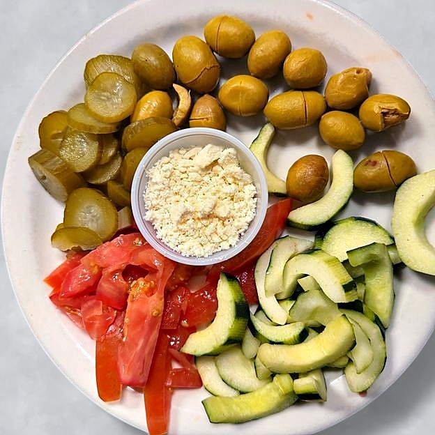 Feta, tomatoes, cucumbers, olive, pickles.